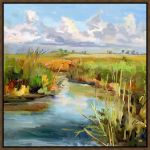 A gentle stream wondering through a meadow in bright hues, by Carol Hallock. This high quality hand-stretched fine art canvas print is framed in a .75" grained walnut brown float frame. A beautiful piece of framed artwork that will look great in any home, adding warmth and character.