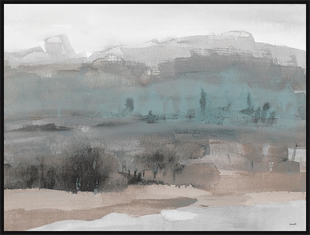A colorful watercolor abstract of a mountain lake in blue hues, by Lanie Loreth. This high quality hand-stretched fine art canvas print is framed in a .75" matte black float frame. A beautiful piece of framed artwork that will look great in any home as a focal piece. Choose a size below. To request a custom size or frame use the Contact Us tab.