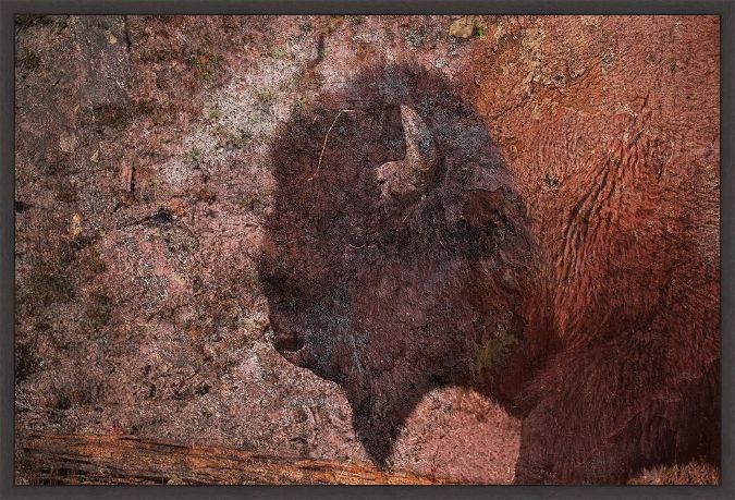 A profile of a majestic buffalo in earthtone hues, by Jamie Phillip. This high quality hand-stretched fine art canvas print is framed in a .75" dark walnut float frame. A beautiful piece of framed artwork that will look great in any home as a focal piece. Choose a size below. To request a custom size or frame use the Contact Us tab.