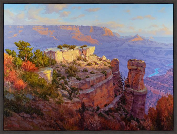 A exquisite rendering of the colors of the desert in full bloom in earthtone tones, by Cody DeLong. This high quality hand-stretched fine art canvas print is framed in a .75" open-grained walnut float frame. A beautiful piece of framed artwork that will look great in any home as a focal piece. Choose a size below. To request a custom size or frame use the Contact Us tab.