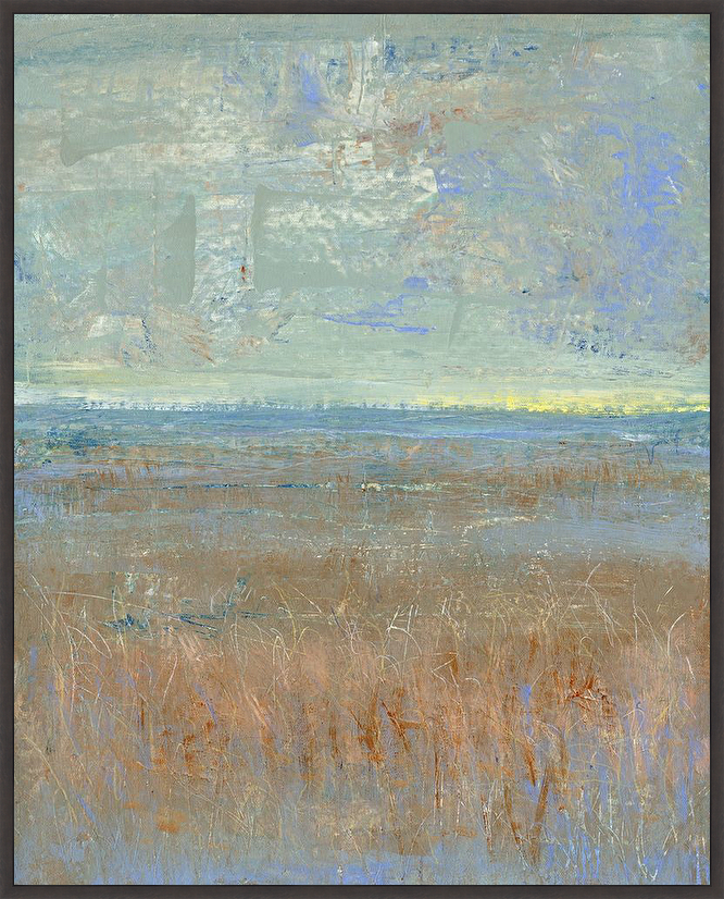 A stunning abstract interpretation of the calm waters of the marsh at evening time in earthtone hues, by Tim O'Toole. This high quality hand-stretched fine art canvas print is framed in a .75" dark walnut float frame. A beautiful piece of framed artwork that will look great in any home as a focal piece. Choose a size below. To request a custom size or frame use the Contact Us tab.