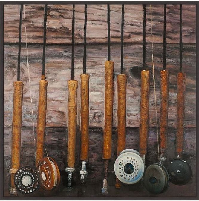 A rustic image of the family fishing rods on the mantel in earth tones, by Atelier B Art Studio. This high quality hand-stretched fine art canvas print is framed in a 0.5 inch dark walnut brown float frame. A beautiful piece of framed artwork that will help make your house a home. Choose a size below. To request a custom size or frame use the Contact Us tab.