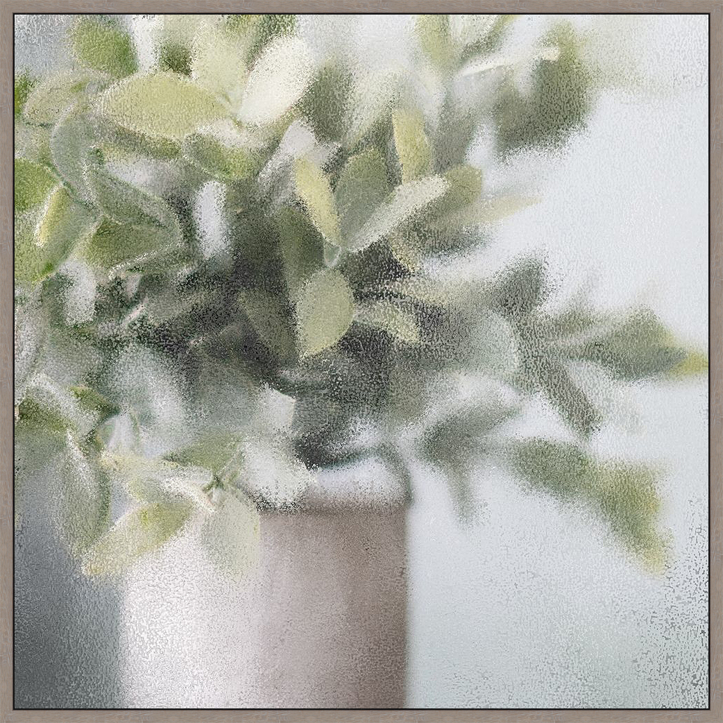 A frosted bouquet of botanical greens in a vase in green tones, by Allen Kimberly. This high quality hand-stretched fine art canvas print is framed in a .75" grey grained float frame. A beautiful piece of framed artwork that will add that perfect pop of color to any space. Choose a size below. To request a custom size or frame use the Contact Us tab.
