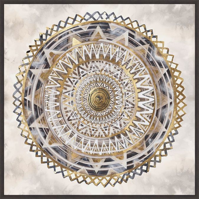 A decorative seal in metallic southwestern patterns in gold tones, by Eva Watts. This high quality hand-stretched fine art canvas print is framed in a .75" dark walnut float frame. A beautiful piece of framed artwork that will add that perfect pop of color to any space. Choose a size below. To request a custom size or frame use the Contact Us tab.