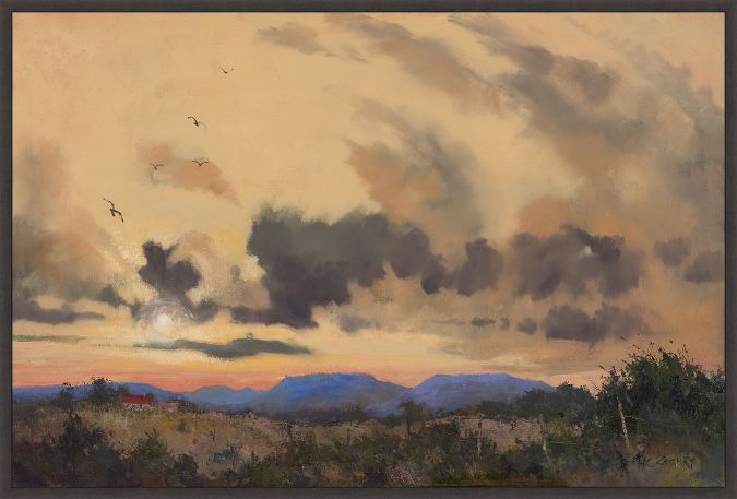 A prairie ranch anticipates much needed relief in sandy brown tones, by H.C. Zachry. This high quality hand-stretched fine art canvas print is framed in a .75" brown grained float frame. A beautiful piece of framed artwork that will look great in any home as a focal piece. Choose a size below. To request a custom size or frame use the Contact Us tab.