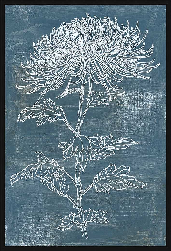 A sketched rendition of a flower bloom in blue tones, by Melissa Wang. This high quality hand-stretched fine art canvas print is framed in a .75" matte black float frame. A beautiful piece of framed artwork that will look great in any home as a focal piece on its own or paired with Indigo Dance I (sold separately). Choose a size below. To request a custom size or frame use the Contact Us tab.