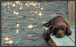 A chocolate lab resting on a dock in sunset hues, by Murray Henderson. This high quality hand-stretched fine art canvas print is framed in a .75" dark walnut float frame. A beautiful piece of framed artwork that will look great in any home or to add personality to a room.