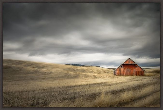A barn amid a field cut just before a storm in earth tones, by Don Schwartz. This high quality hand-stretched fine art canvas print is framed in a .75" dark walnut float frame. A beautiful piece of framed artwork that will look great in any home as a focal piece. Choose a size below. To request a custom size or frame use the Contact Us tab.