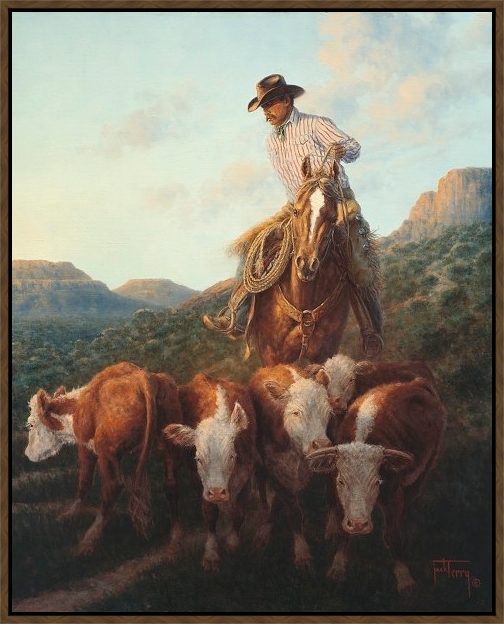 A stray cow get correction in cowboy brown tones, by Texas artist, Jack Terry. This high quality hand-stretched fine art canvas print is framed in a .75" grained walnut brown float frame. A beautiful piece of framed artwork that will add character to any space. Choose a size below. To request a custom size or frame use the Contact Us tab.