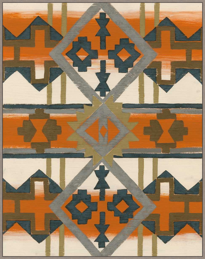 A beautiful southwestern patterned panel in orange and blue tones, by Chariklia Zarris. This high quality hand-stretched fine art canvas print is framed in a .75" rustic grey float frame. A beautiful piece of framed artwork that will look great in any home as a focal piece. Choose a size below. To request a custom size or frame use the Contact Us tab.