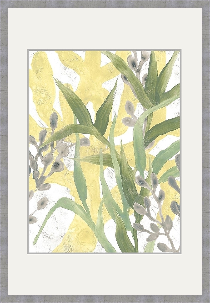 A sea grass fresco in green and yellow hues, by June Erica Vess. This high quality fine art paper print is framed in a 1" silver leaf moulding, mat, and glass. A beautiful piece of framed artwork that will look great in any home to add the perfect pop of color.