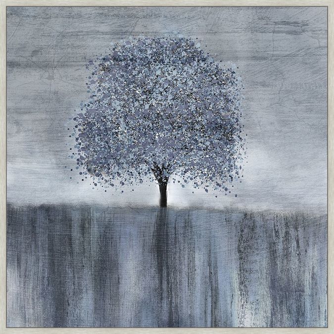 A misty lone tree landscape in blue tones, by Allen Kimberly. This high quality hand-stretched fine art canvas print is framed in a .75" grey grained float frame. A beautiful piece of framed artwork that will look great in any home as a focal piece. Choose a size below. To request a custom size or frame use the Contact Us tab.