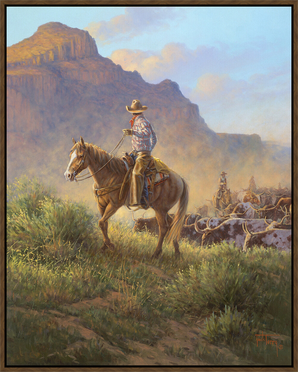 A cowboy riding point for the cattle drive in earth tones, by Texas artist, Jack Terry. This high quality hand-stretched fine art canvas print is framed in a .75" grained walnut brown float frame. A beautiful piece of framed artwork that will look great in any home as a collector's piece. Choose a size below. To request a custom size or frame use the Contact Us tab.