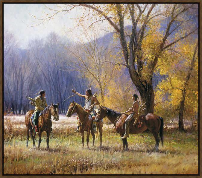 A limited edition art print depicting a gathering of Native Americans in a clearing in autumn tones, by Martin Grelle. This high quality hand-stretched fine art canvas print is framed in a .75" brown walnut float frame. A beautiful piece of framed artwork that will look great in any home as a focal piece. Choose a size below. To request a custom size or frame use the Contact Us tab.