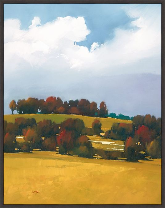 A country hillside in saturated tones, by Greg Stock. This high quality hand-stretched fine art canvas print is framed in a .75" dark walnut float frame. A beautiful piece of framed artwork that will help make any house a home. Choose a size below. To request a custom size or frame use the Contact Us tab.