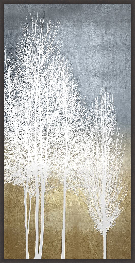A beautiful inteverted transitional winter tree landscape in blue and gold tones, by Kate Bennett. This high quality giclee canvas is framed in a .75" dark walnut float frame. A beautiful piece of framed artwork that will look great in any home as a focal piece or as a pair with Trees on Gold Panel II (sold separately). Choose a size below. To request a custom size or frame use the Contact Us tab.