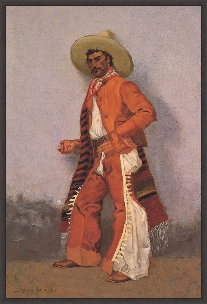 A classic, well dressed spanish cowboy in red-orange hues, by Frederic Remington. This high quality hand-stretched fine art canvas print is framed in a .75" dark walnut float frame. A beautiful piece of framed artwork that will look great in any home as a focal piece. Choose a size below. To request a custom size or frame use the Contact Us tab.