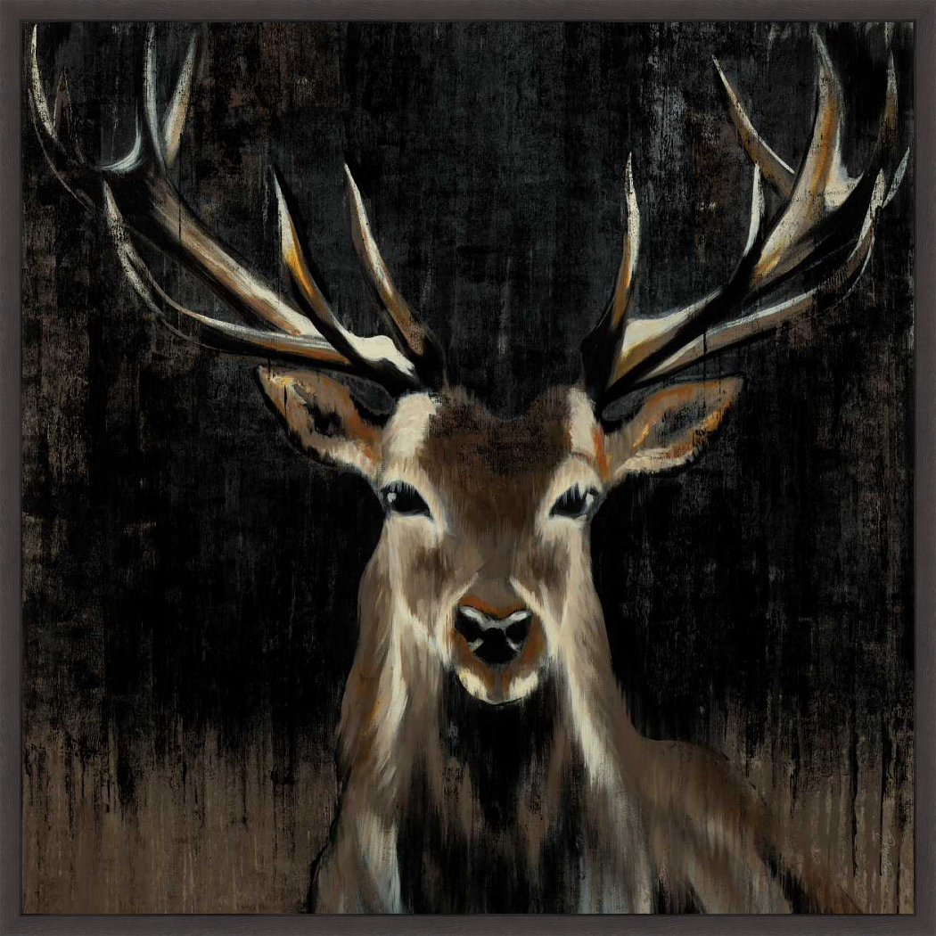 A detailed painting of a young buck standing alert in earth tones, by Liz Jardine. This high quality hand-stretched fine art canvas print is framed in a .75" espresso float frame. A beautiful piece of framed artwork that will warm any home. Choose a size below. To request a custom size or frame use the Contact Us tab.